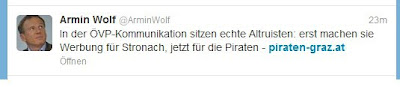 Aber nicht nur Ofer, sondern auch die Grünen liebäugeln mit dem Piratenlabel - im Innsbrucker Gemeinderatswahlkampf 2012 meinten sie ja auch, sie wären ja eigentlich die wahren Piraten (vermutlich, weil sie immer so brav bloggen und das ist ja "Netzpolitik"). Nach dem 3,8%-Wahlerfolg der Piraten in Innsbruck da hatte Peter Pilz sogar die Idee, sich die Piraten doch überhaupt gleich einzuverleiben und sie auf grünen Wahllisten kandidieren zu lassen.